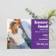 Invite your guests to save your wedding date in humourous style with this fun design which is fully customisable. The text is all aligned to the right, with bold white typography at the top, Booze Food followed by And Bad Dance Moves in lilac, your names, wedding date and location in a mix of both colours, on a purple background. Easily personalise the text and simply upload your favourite photo of you both to replace the sample. A coordinating lilac background is on the back which you can change to a different colour if you wish via the Customise Further option.