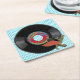 Set of 6 square pulp board disposable coasters with an image of a 50s Rock & Roll 45 rpm record and a vintage image of Jitterbug dancers on a background of blue-on-blue polka dots. The title of the record is “Bop ‘Til You Drop (At My Party).” See matching plastic coaster and paper cocktail napkin. See the entire Nifty 50s Coaster collection in the FOOD/BEV | Coasters section.