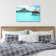 Landscape canvas print of a luxury overwater honeymoon resort in the tropical clear blue lagoon of the pacific island of Bora Bora, near Tahiti, in French Polynesia.