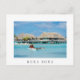 Postcard of two men in an outrigger canoe bringing breakfast service Polynesian style to honeymoon guests in a luxury overwater resort on the tropical, pacific Island Bora Bora, French Polynesia with a white border and the text: 'Bora Bora'.