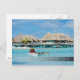 Postcard of two men in an outrigger canoe bringing breakfast service Polynesian style to honeymoon guests in a luxury overwater resort on the tropical, pacific Island Bora Bora, French Polynesia with a fading bar and the text: 'Bora Bora'..