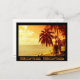 Postcard with an orange sunset on a beach with palm trees on the tropical island of Bora Bora in the Tahiti archipelago French Polynesia in the Pacific Ocean.