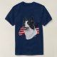 A black and white Border Collie with erect ears in front of a waving American flag. Show your pride in your dog breed and country!