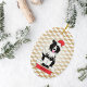 Adorable, black/white Border Collie cartoon graphic wearing a red/white Santa Claus hat, and has pink tongue out. Red/Black banner underneath for adding a custom pet name to. Gold/white geometric pattern background.