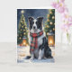 A charming Christmas watercolor artwork featuring a Border Collie wearing a festive plaid scarf, sitting in the middle of a snowy field. A beautifully decorated Christmas tree glows warmly behind, with gentle snowfall and golden lantern light adding to the festive atmosphere. Soft, dreamy edges and delicate brushwork create a cosy holiday feel.