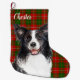 Watercolor illustration of Border Collie dog on festive green and red plaid background. Personalise with name or special message