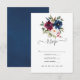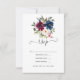 Wedding rsvp card featuring navy blue, white and maroon red peonies and roses with elegant handwriting typography.