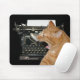 orange or ginger coloured tabby cat yawning in front of a vintage type writer.....bored or blocked writer concept