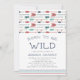 Adorable baby shower invitations for your wild one on the way feature a border of colourful feathered arrows in navy, teal and red. "Born to be wild" appears in navy blue lettering, with your baby shower details beneath.