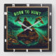 A stylised and vibrant illustration features a hunter in a boat, surrounded by ducks on a lake. The artwork has a distinct tooled leather texture and is rendered in a unique palette of neon green, blue, and brown. The phrase "BORN TO HUNT" frames the central image.