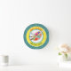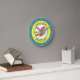Main focus is a artists palette with colourful splodges of paint and two paint brushes through the hole. One brush has blue paint on the bristles the other has pink. The design is inside a white circle with a blue rim. A yellow outer circle has two templates to personalise. One at the top to add a message and one at the bottom to add your name. Lastly the blue outer circle is a background colour that can be changed by clicking on customise and selecting the background colour of your choice.