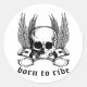 A winged skull with two pistons crossed beneath it with the words "Born To Ride" underneath it all.
