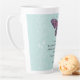 Inspirational quote latte mug with watercolor purple butterfly on light blue and white patterned background.