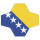 The flag of Bosnia and Herzegovina contains a wide medium blue vertical band on the fly side with a yellow right triangle abutting the band and the top of the flag. The remainder of the flag is medium blue with seven full five-pointed white stars and two half stars top and bottom along the hypotenuse of the triangle.