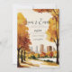 This wedding invitation features a painting of Boston, Massachusetts city skyline with trees.