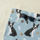 Cute Boston Terrier dogs with black and white coats sit and stand scattered dog bones and paw prints pattern.