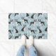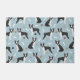 Cute Boston Terrier dogs with black and white coats sit and stand scattered dog bones and paw prints pattern.