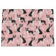 Cute Boston Terrier dogs with black and white coats sit and stand scattered dog bones and paw prints pattern.