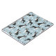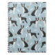 Cute Boston Terrier dogs with black and white coats sit and stand scattered dog bones and paw prints pattern.
