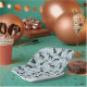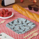 Cute Boston Terrier dogs with black and white coats sit and stand scattered dog bones and paw prints pattern.