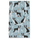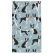 Cute Boston Terrier dogs with black and white coats sit and stand scattered dog bones and paw prints pattern.