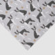 Cute Boston Terrier dogs with black and white coats sit and stand scattered dog bones and paw prints pattern.