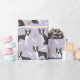 Cute Boston Terrier dogs with black and white coats sit and stand scattered dog bones and paw prints pattern.