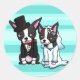 Featuring an adorable pair of cartoon Boston Terriers dressed as a bride and groom. The Groom wears a fetching black and white tuxedo with a red bow tie and the bride wears a pretty white dress and a veil adorned with flowers. Perfect for dog lovers!