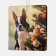 This doggie ornament features a handsome Boston terrier. Peeking from behind a Christmas tree.