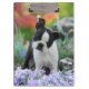 A young cute Boston Terrier female puppy, black with white markings, in a flowery garden. Boston Terriers, also called Boston Bulls or "American Gentlemen", are a gentle, friendly and intelligent dog breed for companionship. A puppy-eyed doggy photo taken by Katho Menden, this acrylic clipboard is an enchanting gift idea for dog and pet lovers. http://www.zazzle.com/kathom_photo You can add your own text by pressing the customise it button.