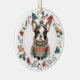This cute Holiday ornament features a watercolor image of a black and white Boston Terrier dog dressed in his winter sweater and hat. The image is framed within a colourful circle wreath made up of various Holiday images, including a snowman, bells, candy cane, stocking, holly, and more! The back of the ornament has the same wreath image with your custom text in green, gold, and red.