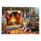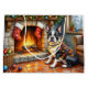 A delightful Christmas artwork featuring a charming Boston Terrier sitting beside a glowing fireplace decorated with stockings and twinkling Christmas lights. This cozy holiday scene captures the Boston Terrier’s playful personality and loving spirit, making it perfect for dog enthusiasts and festive home decor. Bring warmth, joy, and a touch of holiday cheer to your space with this adorable Christmas-inspired art piece.