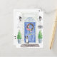 Announce your new address with our stylish announcement featuring a Boston Terrier, blue front door, welcome mat, slate sign, topiaries and a floral wreath set on a grey brick background.