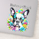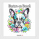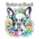 Cute Boston Terrier Dog surrounded by pink, yellow and blue flowers. Ai art. Cute gift for Boston Terrier owners. Boston on board.
