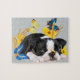 Adorable Boston Terrier plays in garden of colourful flowers when large bumble bee lands on his nose. This is a Ooak Friskybizpet Design and is available on apparel, household and office items, posters, greeting cards, and many more fun merchandise for fans of the Boston Terrier Dog.