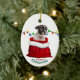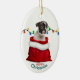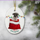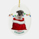 On the front of this Holiday ornament is an image of an adorable black and white Boston Terrier puppy in a red and white Christmas gift bag. Behind the dog is a string of colorful Holiday lights. The text at the bottom says "Merry Christmas". The back of the ornament has the same image with a custom name field.