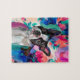 Build your own piece of art with this colourful boston terrier puzzle. Floral background in pink, blue and purple colours. Great gift for pet lovers. Available in small and big sizes. Dog puzzle