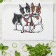 Original artwork by Off-Leash Art of two Boston Terriers, one rare coloured Boston, both clutching a red leash.