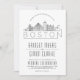 A unique wedding invitation for a marriage taking place in the beautiful city of Boston. This invitation features a stylised illustration of the city's unique skyline with its name underneath. This is followed by your wedding day information in a matching open lined style. On the reverse side of the invitation is a deep grey colour to complement the look and feel. All individual elements of the invite card are unlocked so feel free to change or add any details necessary by using the customisation function. You can add a photo to the reverse side and add a black and white filter to it. Also, you can experiment with the many unique thicker paper types and cuts available. Matching RSVP cards, belly bands, tote bags, and more are available.