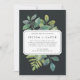 Vintage botanical wedding invitation displays your wedding details in modern inky off-black lettering, on a background of painted green watercolor leaves, branches and ferns. A rich, dark background adds drama and elegance.