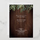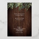 Botanical design at top with barnwood background and white text. "wedding", "and", and string lights are silver foil.