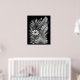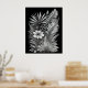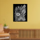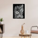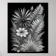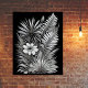 An intricate and detailed illustration of tropical flowers and reeds arranged in a beautiful composition. The black and white colour scheme adds a sense of elegance to the illustration. This illustration is designed with a black background to allow the flowers and reeds to stand out.