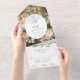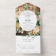 Beautiful All-In-One wedding invitation invites your guests in elegant style. This classic invitation includes soft pastel tones and greenery modern watercolor florals in shades of peach, white, cream ivory, sage and a brighter deeper green. This personalised one-piece attached wedding invite coordinates with our full botanical boho floral collection of wedding stationery, decor, and event paper goods.