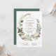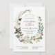 These elegant holiday wedding invitations feature a rustic watercolor wreath with pinecones, branches, berries, leaves, and white roses.