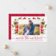 Photo Christmas Pregnancy Announcement Cards. Expecting parents! Modern red hand lettered typography script "the More the Merrier!" card to share your happy news with family and friends in the holiday season. Features watercolor red winter botanical floral, pine branches, red berries and holly with foliage arrangement. At the backing red white snowfall graphic design. Personalize by replacing the text template and the horizontal photo. If you need help or matching items, please contact to me!
