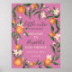 Botanical citrus orange little cutie baby shower welcome sign with pretty oranges, clementines citrus fruits illustration, green branches and leaves with white flowers and a modern script brush font on pink . perfect gender neutral baby shower for winter, spring and summer citrus season! Featuring a pretty citrus clementine botanical pattern at the back.