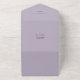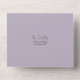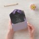 Purple botanical floral and dark grey geometric designs with white text. Tear away rsvp with qr code. Back flap feature return address. Outside features recipient address.