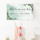 Rustic wedding welcome banner featuring a dusty green/blue faded watercolor background, botanical eucalyptus leaves, splashes of faux gold foil, and a text template that is easy to personalise.
