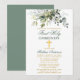 Modern Elegant First Holy Communion Invitation includes watercolor eucalyptus leaves and other beautiful botanical greenery foliage. Gold Cross. Sage Green Back.