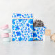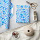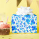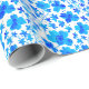 Wrapping paper in a watercolor-style floral pattern with flowers in shades of deep blue on a white background. Large, detailed blossoms alongside smaller, simpler flowers and delicate branching stems, for an airy, botanical feel.